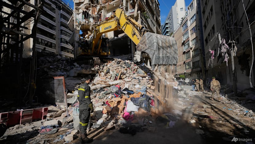A Lebanese civil defense worker looks on as an excavator operates on the rubble of a building destroyed in an Israeli airstrike a day earlier in Beirut, Lebanon, on Apr 9, 2026. (Photo: AP/Hussein Malla)